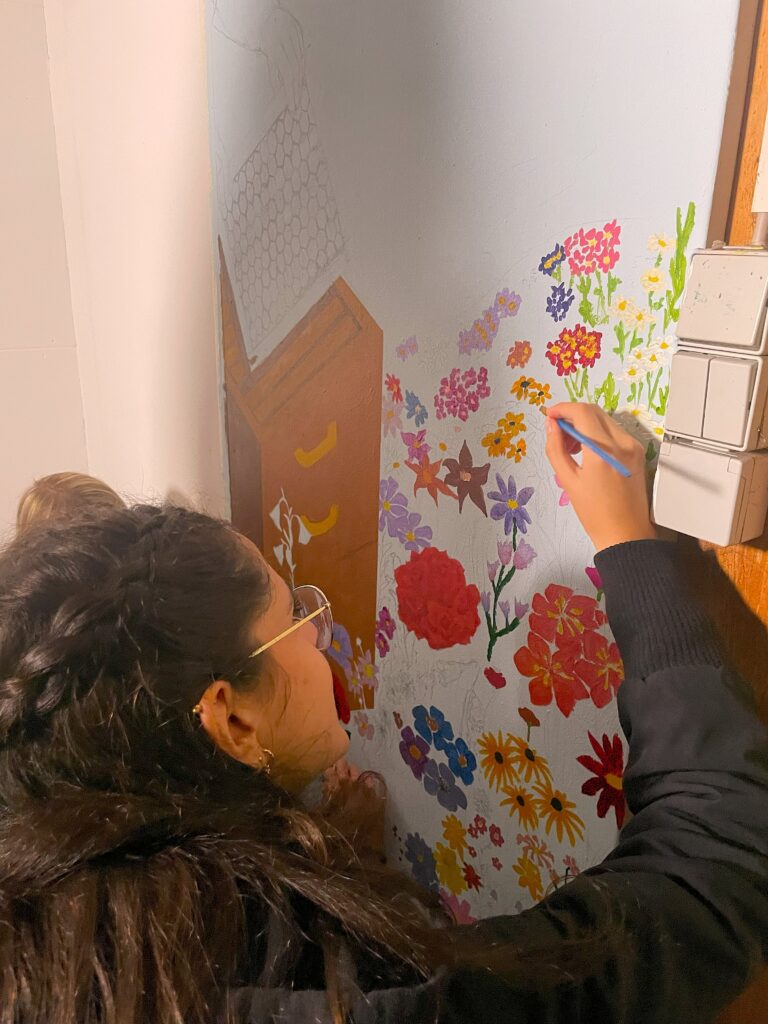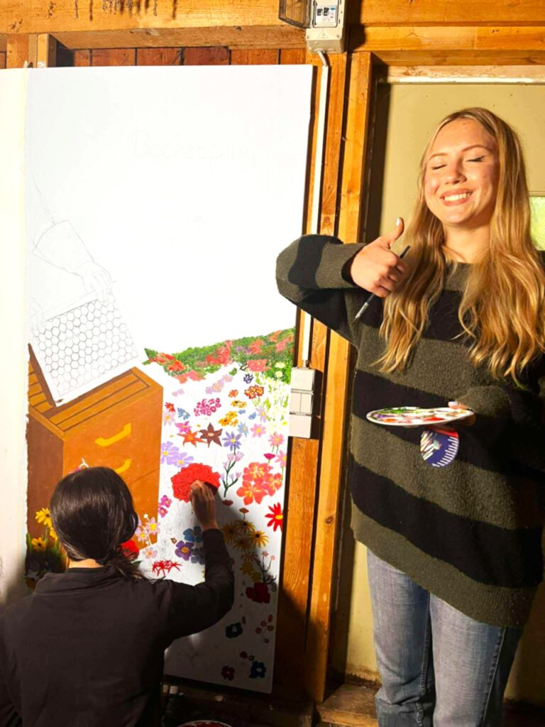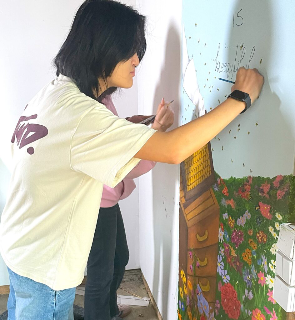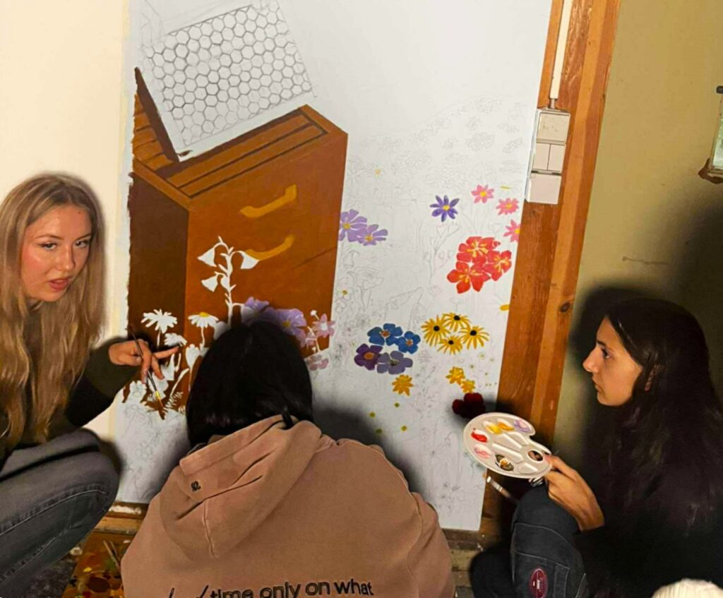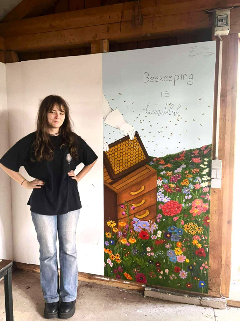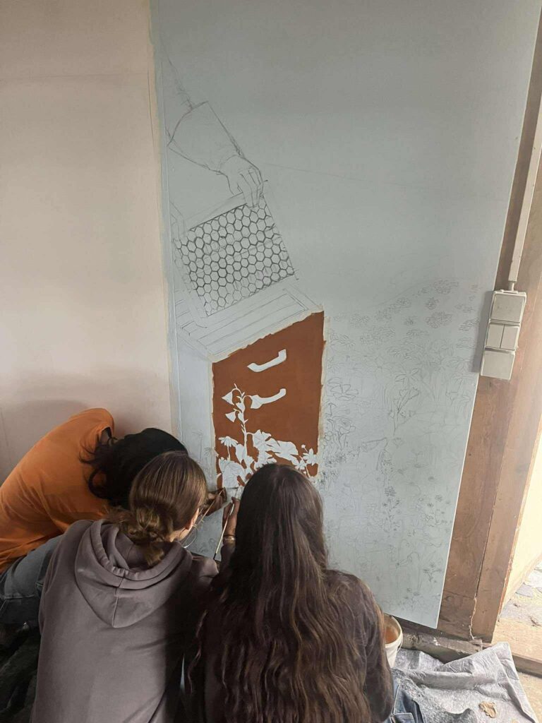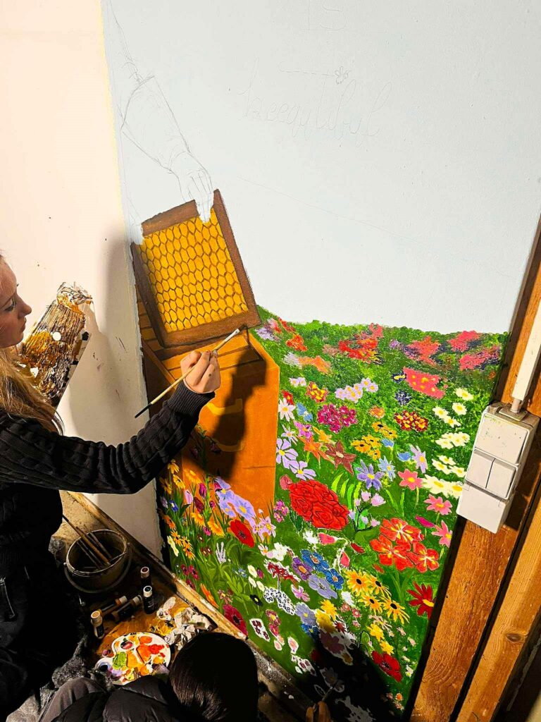 Since the hut is located in the forest quite far from the cloister, the artists have to walk there every day to work on the painting. Their piece, titled “Beekeeping is beeautiful,”focuses not only on the vitality of bees but also honors the quiet legacy of the beekeeper who once cared for them.