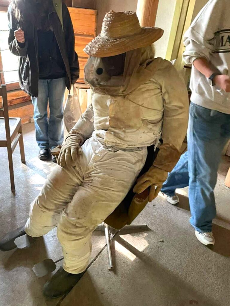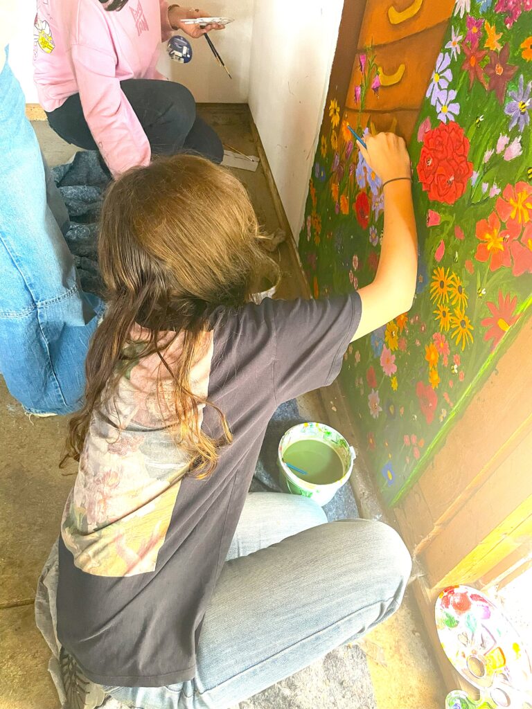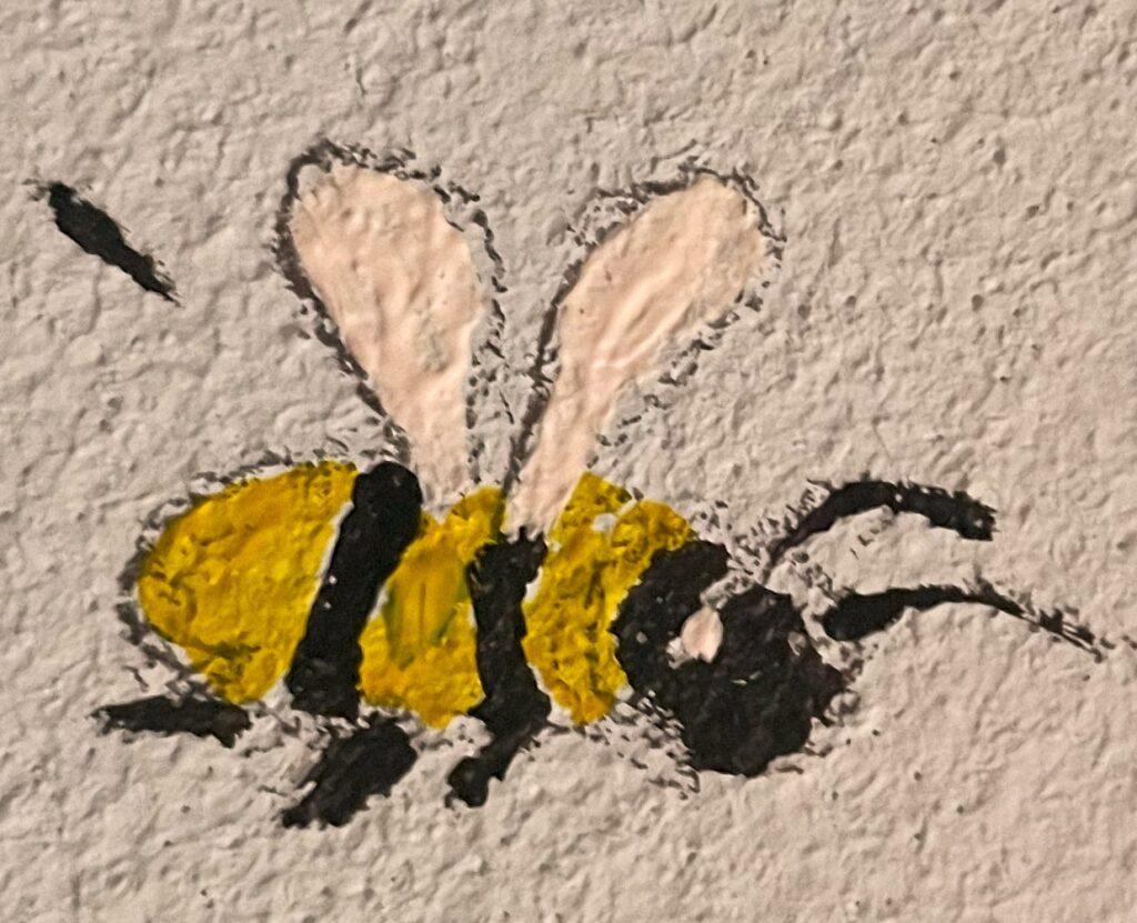 These fascinating animals inspired Michalina, leader of the art workshop here in St. Marienthal. She heard a story about a local beekeeper who had lived in a hut near Marienthal and died a few years ago. His hut is now empty, and Michalina decided to paint on its walls. Knowing very little about bees, she began searching for images and studying their biology. She generated many ideas for the “workshoppers” on how to present bees and beekeeping, ranging from each person painting their own big flower with their own bee to creating a detailed collage about beekeeping. Later, at the first workshop meeting, Michalina presented her ideas and asked everyone to sketch something as well. Together, they combined these sketches into a single vision: a beehive surrounded by bright, delicate flowers. One of these is the spider lily, also called the “flower of death.” It represents the beekeeper who once owned the hut. His things and gear are still there, arranged in a way that looks like a person sitting on a chair. Artists call this figure “The Ghost of the Beekeeper,” and believe me, it can be a bit scary—especially when it gets dark.